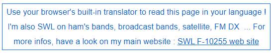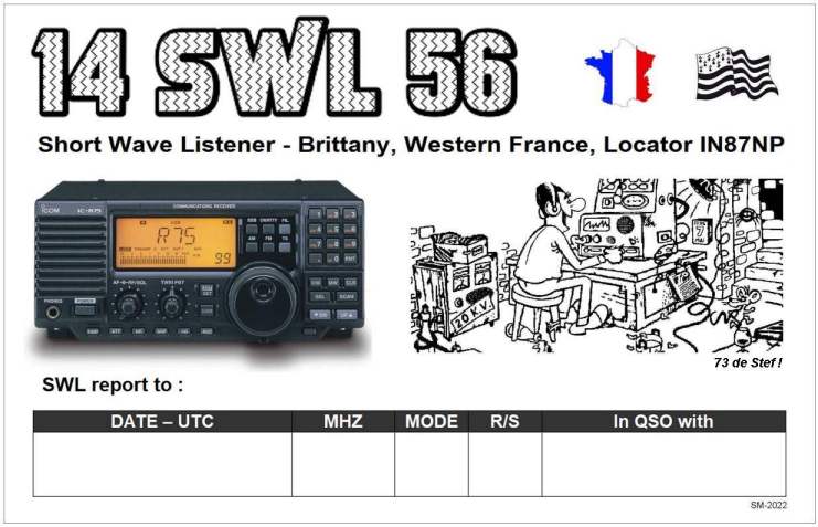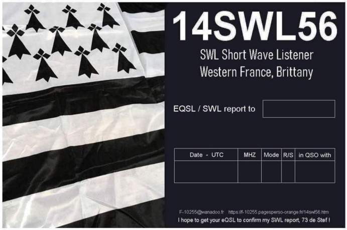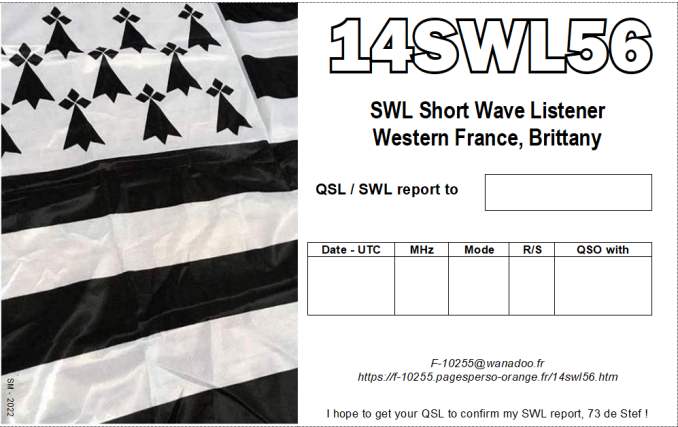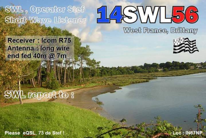 I'm Stephane, "Stef" from Brittany, North West France. I'm short wave listener (SWL). The SWLs are radio enthusiasts but only in reception. Like the DXers, they build antennas, constantly improve their receiving station, work DX and collect DXCC / Divisions from all over the word. Your QSL or eQSL is precious !