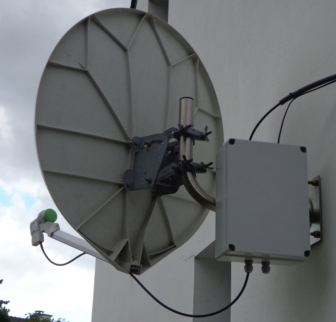 Mon installation est composée d'une parabole Visiosat fibre de 85 cm (occasion Lbc 30 €), d'un Lnb PLL twin Octagon OTLG Green HQ (15 €) de deux filtres pass-bas Goobay 67510 (8 € pièce) et d'un convertisseur dédié Amsat DL (178 €). J'ai ajouté un Minitiouner-S, semi-kit distibué par le REF (94 €) pour la réception de la DATV sur le transpondeur large bande.