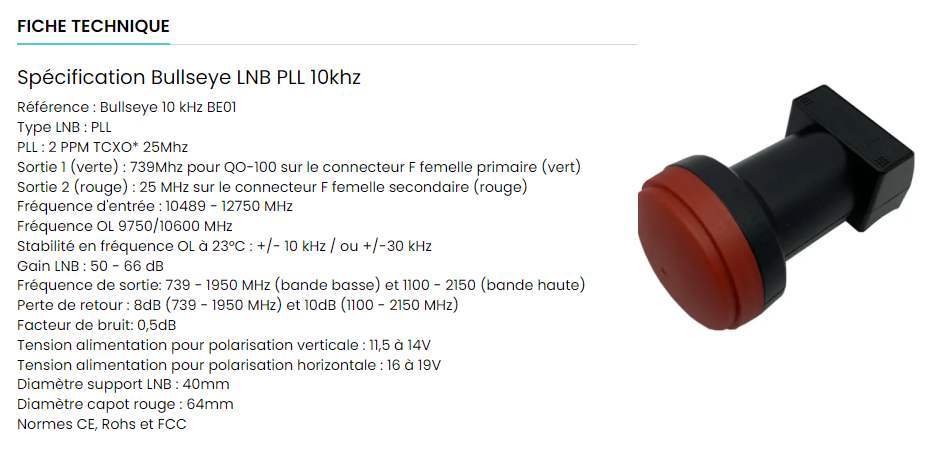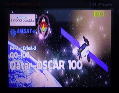 Alignement de la parabole : QO-100 est positionné à 25,76° Est (144,2° magnétique), élévation 28,6°, skew Lnb - 23,7°. Repérer Astra 3B (23,5° Est, élévation 29,5°) et déplacer la parabole de quelques centimètres vers la gauche et vers l'horizon ou repérer Astra 2 (F,G ... 28,2° Est, élévation 27,5°) et déplacer la parabole de quelques centimètres vers la droite et vers le ciel (valable pour l'ouest de la France). Le positionnement précis requiert de disposer d'un récepteur Sdr ou d'un "satellite finder" type GT Media V8. [Mesures au GT Media V8 finder : -29 à -31 dBm, puissance 69 à 71 %, qualité 41 à 43 %] |