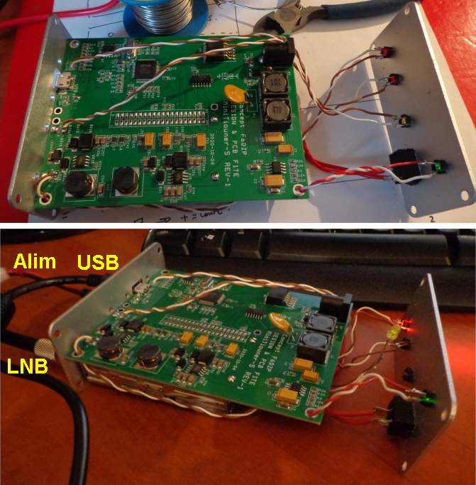 Le Minitiouner-S est vendu par le REF en semi-kit avec un boitier pré-percé. Le boitier, sans interrupteur, comporte des entrées et sorties (RF, USB, alimentation) sur les deux faces. Le but étant probablement de séparer HF, data et alim DC. Si, comme moi, vous préferez les montages que l'on peut mettre hors tension avec un interrupteur et avec une face avant comportant les commandes et voyants et une face arrière les entrées/sorties ; il existe une solution : inverser le sens du panneau arrière (comportant l'entrée alim), agrandir l'ouverture prévue pour la fiche jack alim afin d'y loger un mini interrupteur et percer quatre trous pour les leds et enfin percer un trou pour une fiche jack d'alimentation sur le panneau arrière, sous la prise USB. Le panneau comportant leds et interrupteur devient la face avant et l'ensemble des entrées/sorties est releguée sur l'autre face. Evidemment, cela nécessite du cablage supplémentaire (cliquez sur les images ci-dessous pour plus de détails).