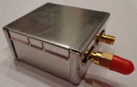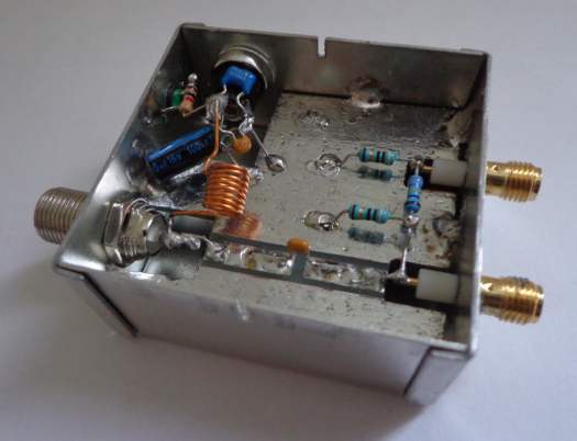 Les condensateurs de découplage sont montés au plus prêt de l’entrée DC. Il convient de soigner les liaisons de masse. La plaque de circuit imprimé est soudée au boitier à plusieurs endroits. Il dispose de deux sorties, l’une sans atténuation, l’autre avec un coupleur / atténuateur 75 Ohms de 20 dB. Idéalement, il devrait être plus compact, comporter des composants SMS et une ligne 75 Ohms. Le niveau des pertes d’insertion n’est probablement pas optimisé mais les LNB ont un niveau de sortie très élevé. Idéalement également, une terminaison 75 Ohms sera positionnée sur la SMA non utilisée.