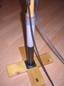 Le pied doit permettre la rotation de l'ensemble. le pied en bois est enfoncé dans un tronçon de tuyau pvc. La jonction (esthétique) est assuré par un capuchon de spray découpé aux dimensions du bois. Le tout est enfilé librement dans une pièce métallique fixée au socle (vendue comme pied de meuble dans les GSB). Une bille du bon diamètre est préalablement déposée dans le fonds. La rotation est parfaite et sans effort, vous venez de réinventer le roulement à bille ! |