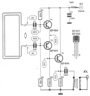 Composants R1, R2 : 82 kOhms R3 : 560 Ohms R4 : 220 Ohms C1, C2 : 2nF2 céramique C3, C4 : 100 nF céramique T1, T3 : BF 494 T2 : BF 451 (BF450) |