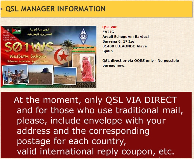 S01WS is the only one station of the country and EA2JG is the Qsl manager.