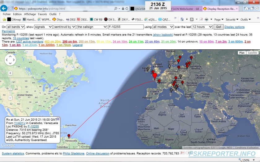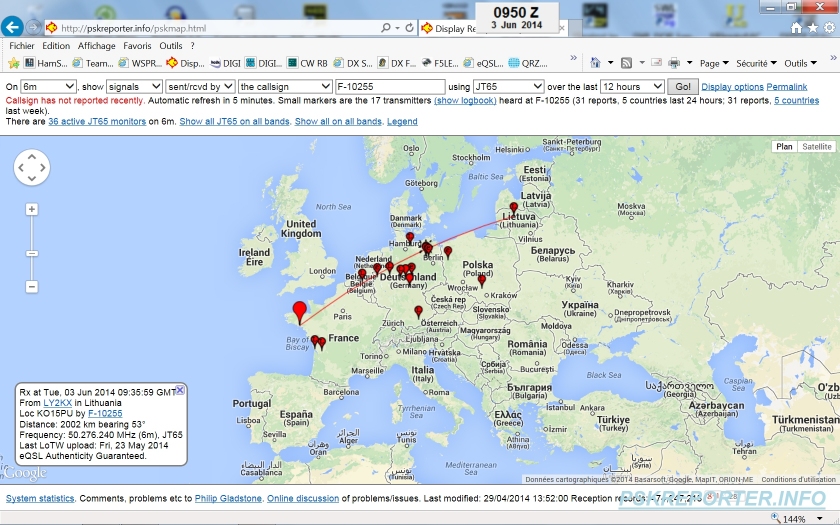 PSK Reporter, mes spots JT65 6m. Le site permet de connaître la distance des stations reçues. |