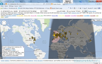 PSK Reporter, mes spots ROS 20m. On constate la réception de VE7HF, côte Ouest, sur le trajet de la grey line. Les puissances utilisées en ROS sont souvent très faibles. |