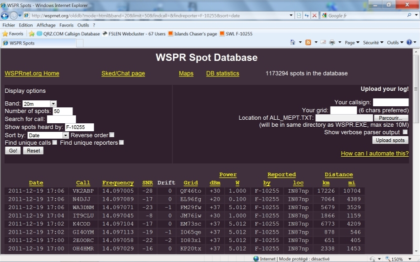 PSK Reporter, mes spots JT65 20m |