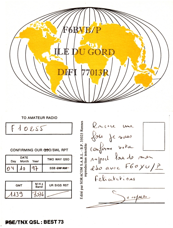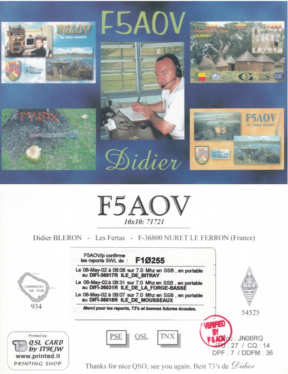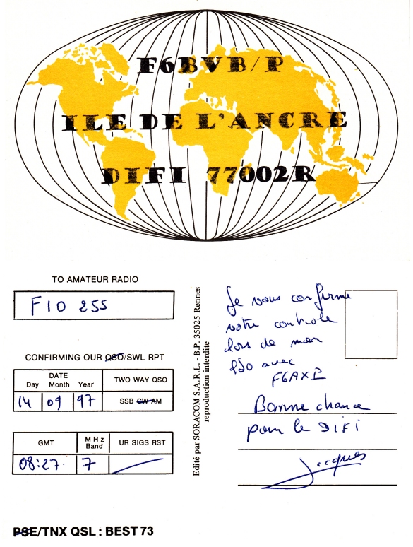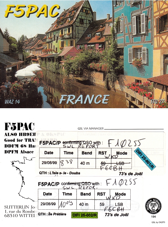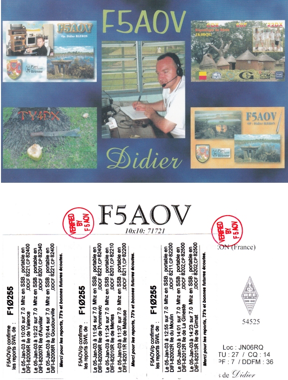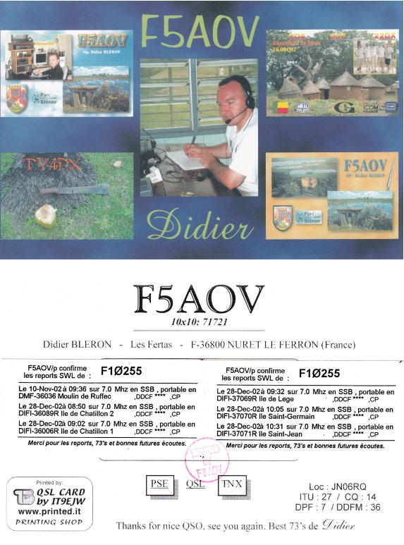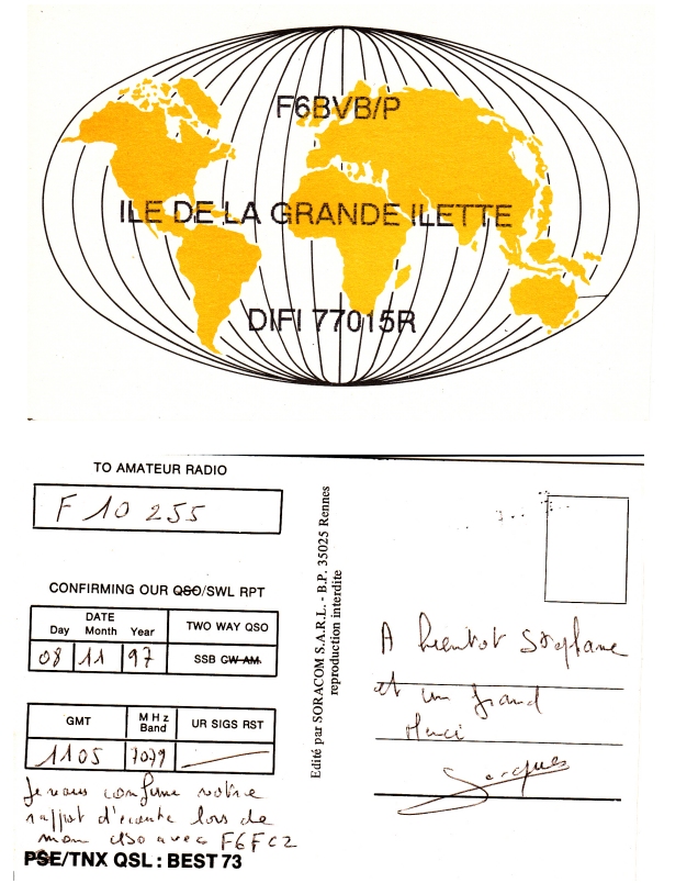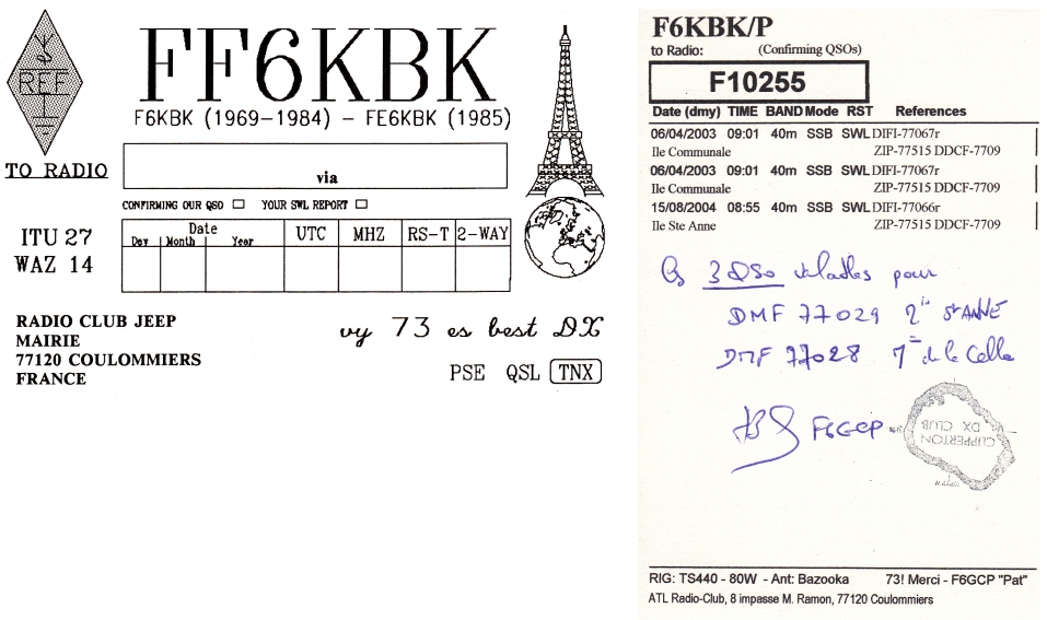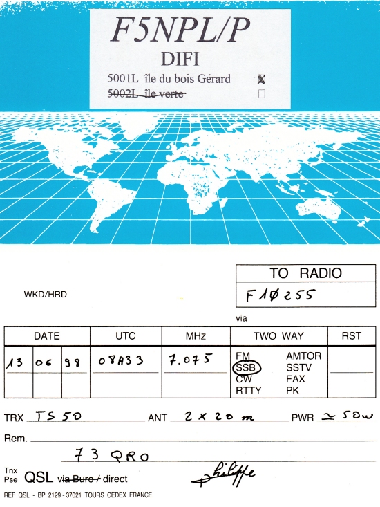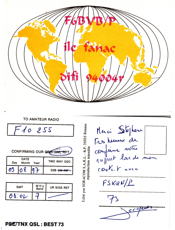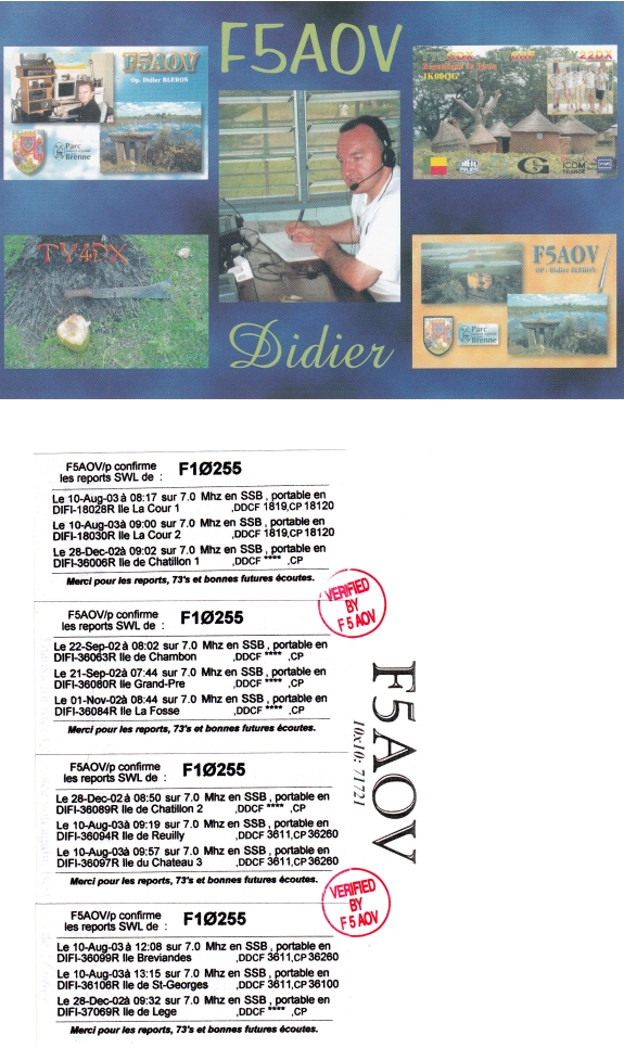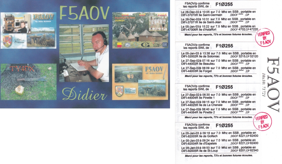 Qsl - Contrées Dxcc - Dxcc countries Qsl - Contrées supprimées - Deleted Dxcc Qsl - Contrées non DXCC - Non Dxcc countries Qsl extra-terrestres - Extraterrestrial Qsl Qsl des îles de la France métropolitaine (DIFM) Qsl des îles françaises d'Outremer (DIFO) Qsl des îles du Morbihan (DIM) Qsl radiodiffusion & utilitaires - Broadcast & utilitary