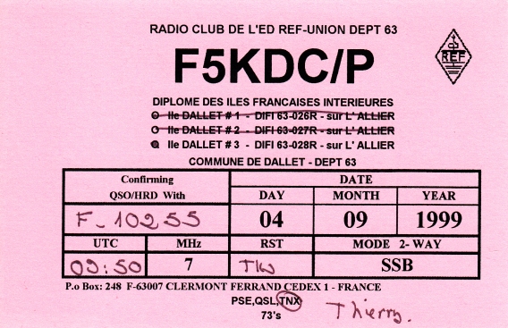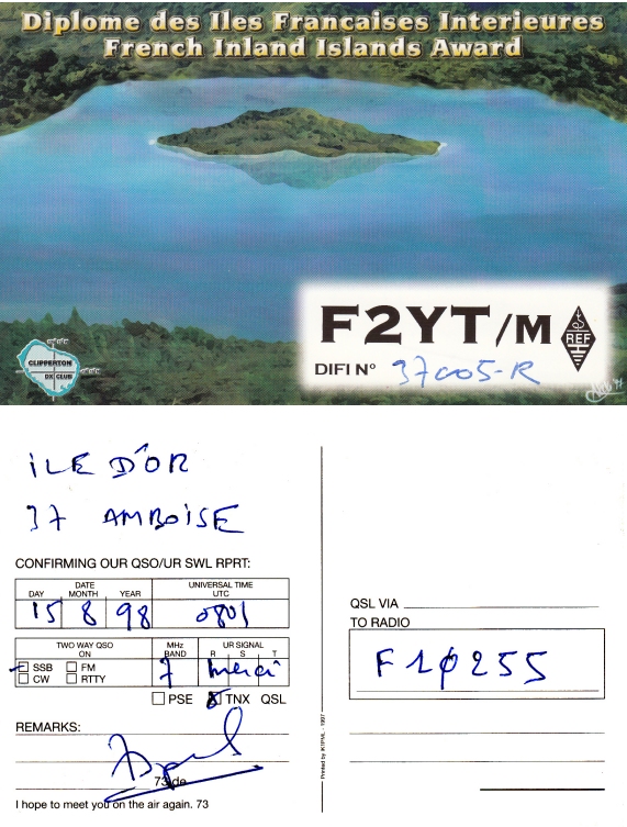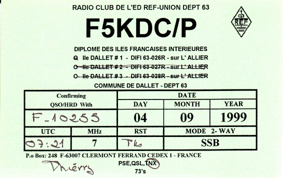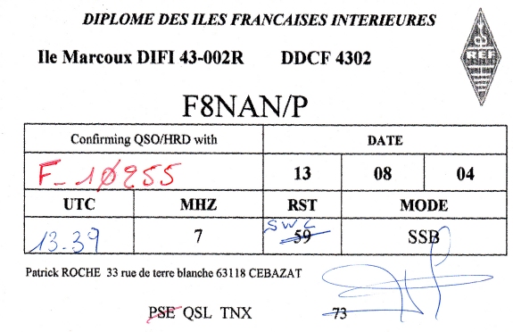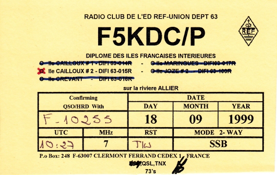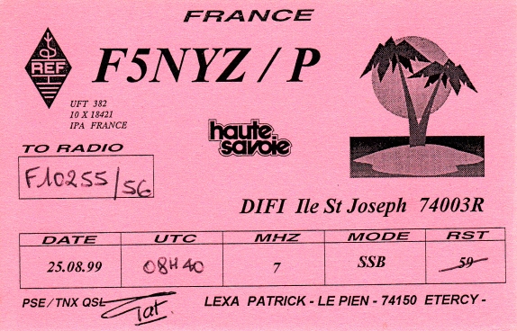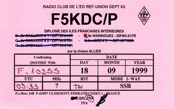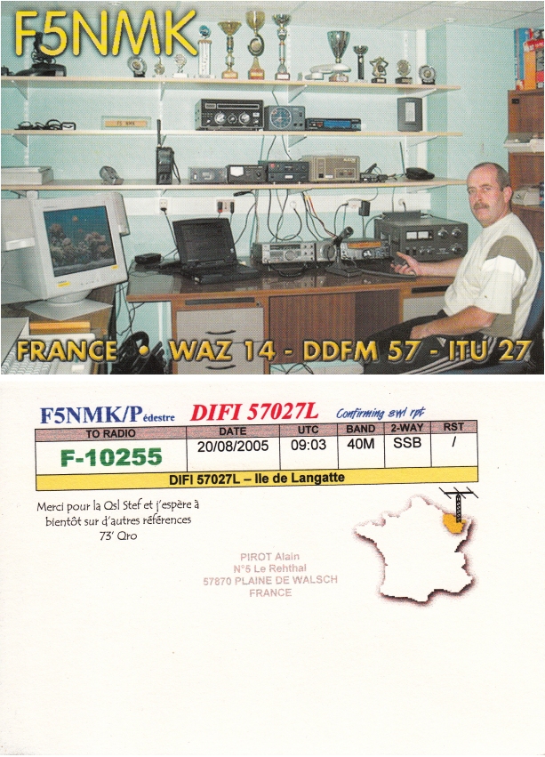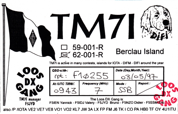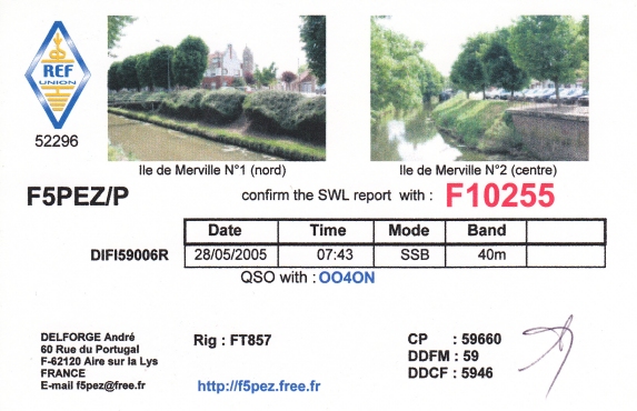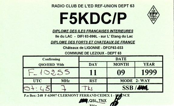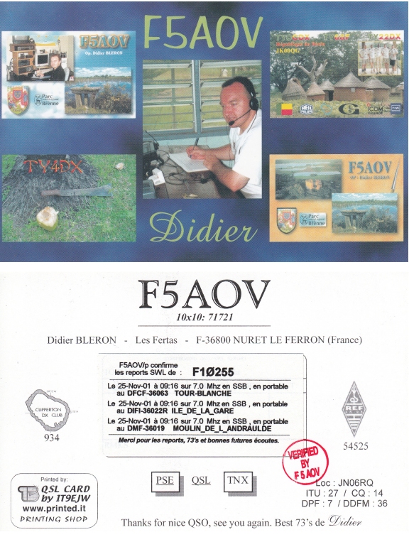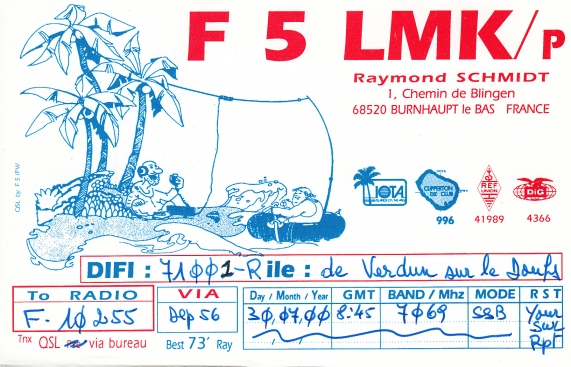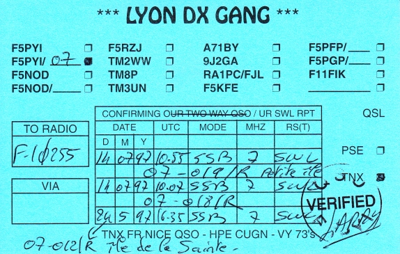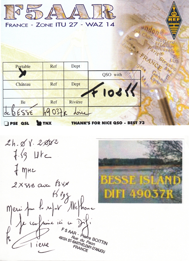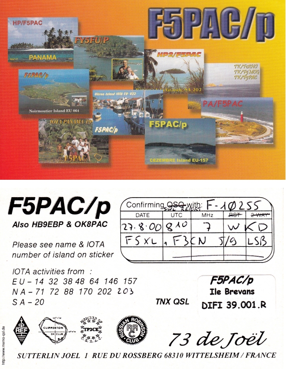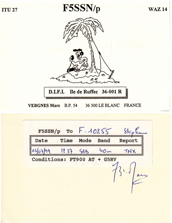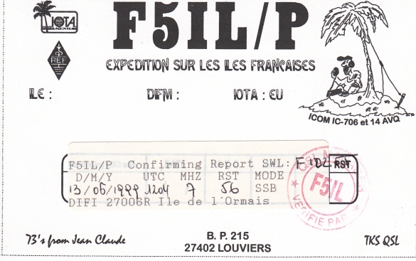 Qsl - Contrées Dxcc - Dxcc countries Qsl - Contrées supprimées - Deleted Dxcc Qsl - Contrées non DXCC - Non Dxcc countries Qsl extra-terrestres - Extraterrestrial Qsl Qsl des îles de la France métropolitaine (DIFM) Qsl des îles françaises d'Outremer (DIFO) Qsl des îles du Morbihan (DIM) Qsl radiodiffusion & utilitaires - Broadcast & utilitary