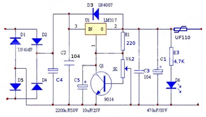 Liste des composants : D1 à D5 : 1N4007, D6 : Led, C1 : 470 uF 50V, C2, C3 : 100 nF céramique, C4 : 2200 uF 50V, C5 : 10uF 25V, R1 : 220 Ohms, VR2 : 4,7 KOhms, R3 : 4,7 KOhms, Q1 : 2N5551, U1 : LM317T, FU : Polyswitch UF110