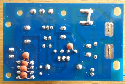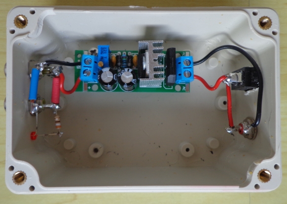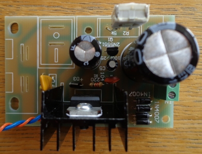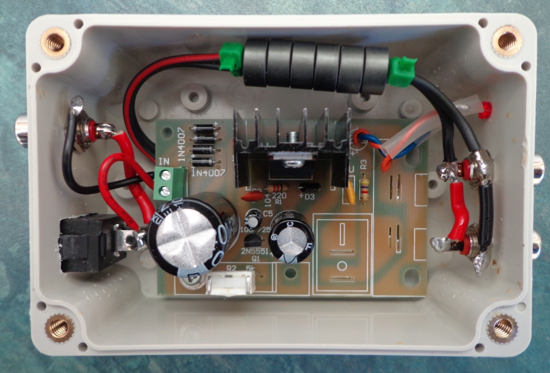 Convertisseur de tension à base de LM317T : entrée 5-35V AC ou 6-25V DC, sortie 1,25-30V DC, max 1A. Le montage a été réalisé à partir d'un kit vendu à un prix plus que modique. Le kit est livré avec un potentiomètre (VR2) qui permet de faire varier la tension de sortie. Il a été remplacé par une résistance ajustable avec sortie fixée à 9V. Des capas de 10 nF ont été ajoutées en parallèle sur les diodes et des ferrites Amidon FB-73-2401 sur les cables de sortie. |