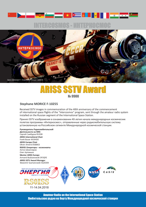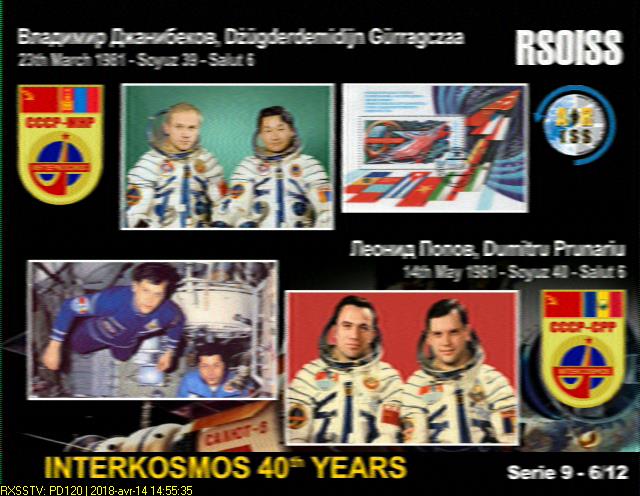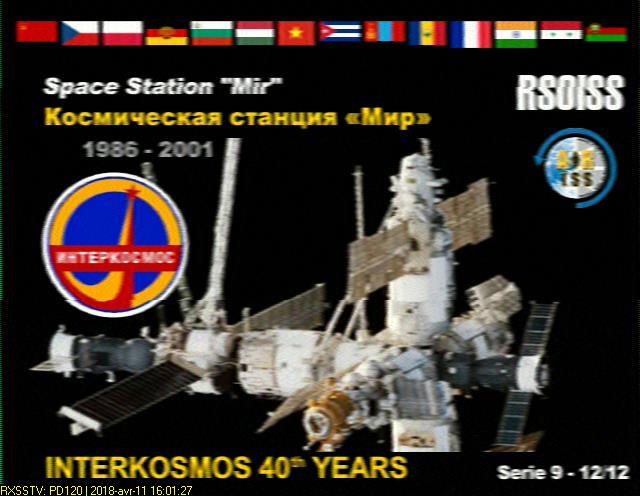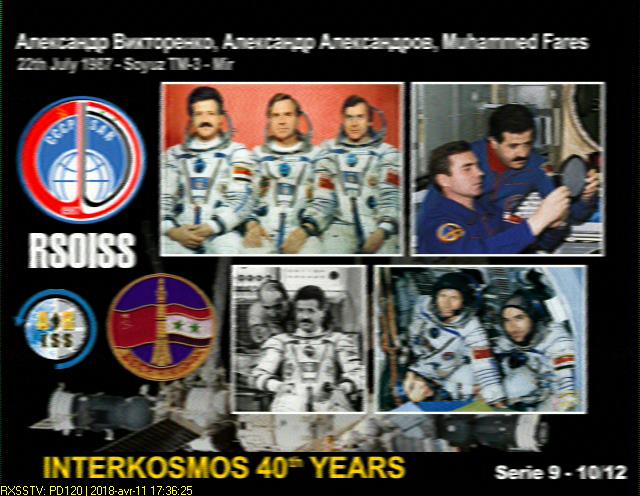 Série de 12 images transmises en mode PD120 par l'ISS du 11 au 14 avril 2018 pour la commémoration du "Cosmonautics Day", 40ème anniversaire du premier vol habité (12 avril 1961 Yuri Gagarin). Reçues avec : clef Sdr Rtl.com V3 + Lna4all + antenne QFH dans le grenier. Détails ici. Logiciels : prévisions Orbitron, SDR#, VBcable, RX SSTV |