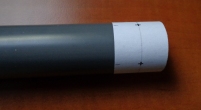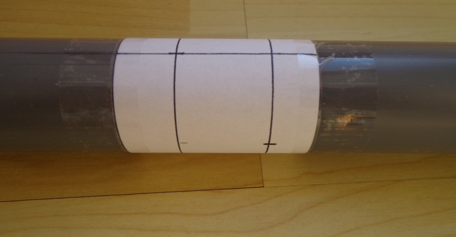 Aligner les trous sur le tuyau de PVC : poser le tuyau sur un support plan, calé contre une paroi verticale. Poser le crayon à plat sur la surface horizontale devant le tuyau et tracer. Coller les deux bandes de papier autour des tubes en alignant les trous et en respectant la distance de 560 mm entre les trous du haut et la rangée de trous du bas. Percer.