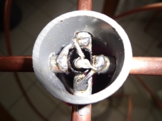 Assembler les différents éléments en vrillant et allongeant les boucles pour les ajuster aux tubes horizontaux. L'ajustage se fait "à l'oeil". Vue du haut, l'hélice "tourne" dans le sens opposé aux aiguilles d'une montre. Les éléments "horizontaux" supérieurs de la grande boucle seront légèrement obliques afin de permettre l'assemblage. Emboîter les tubes dans les coudes. Nettoyer les parties à braser. Enduire de graisse décapante et braser. Le tuyau Pvc pourra être protégé de la chaleur par un chiffon humide. S'assurer que la soudure pénètre bien dans les raccords et assure un bon contact électrique. Les parties horizontales seront maintenues en place, afin d'éviter qu'elle ne coulissent dans le tuyau Pvc, avec de la colle chaude.