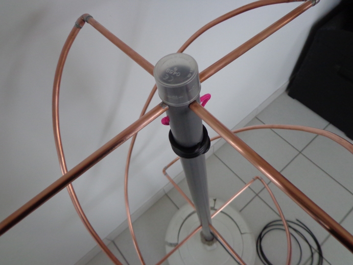 Le balun est constitué de 4 tours de câble coaxial bobiné autour du tube PVC. Faire un essai à blanc afin de déterminer la distance entre les deux trous à percer. Le câble coaxial descend par le tube PVC.