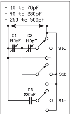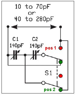 Un condensateur fixe C2 de 120 pF est connecté en parallèle et permet de modifer la variation de capacité de 140 à 260 pf. Le commutateur S1 permet de passer de l'une à l'autre configuration. |