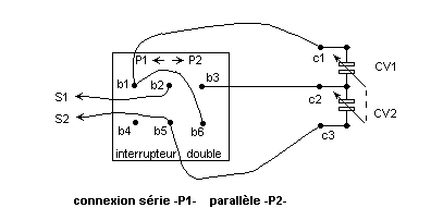 c1 c2 c3 : sorties du CV double cage. b1 à b6 : broches de l'interrupteur double vu du dessus.