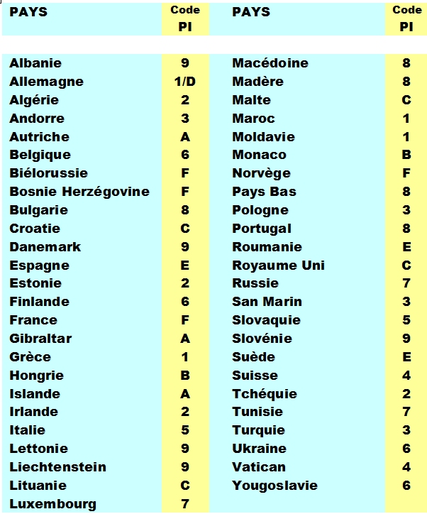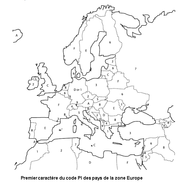 | 1er caractère (Pays) | 2ème caractère (Zone) | 3ème et 4ème caractères (Programme) |