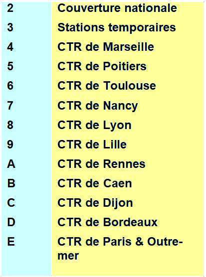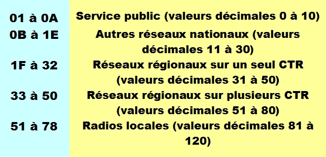 - Deuxième caractère : indicatif d'extension géographique du réseau d'émetteurs.